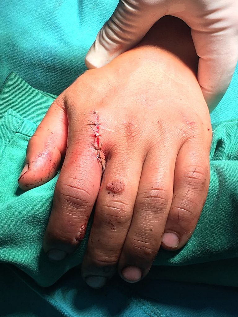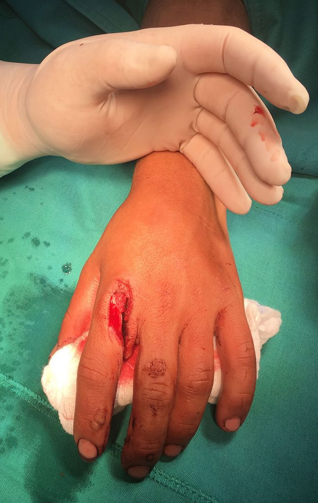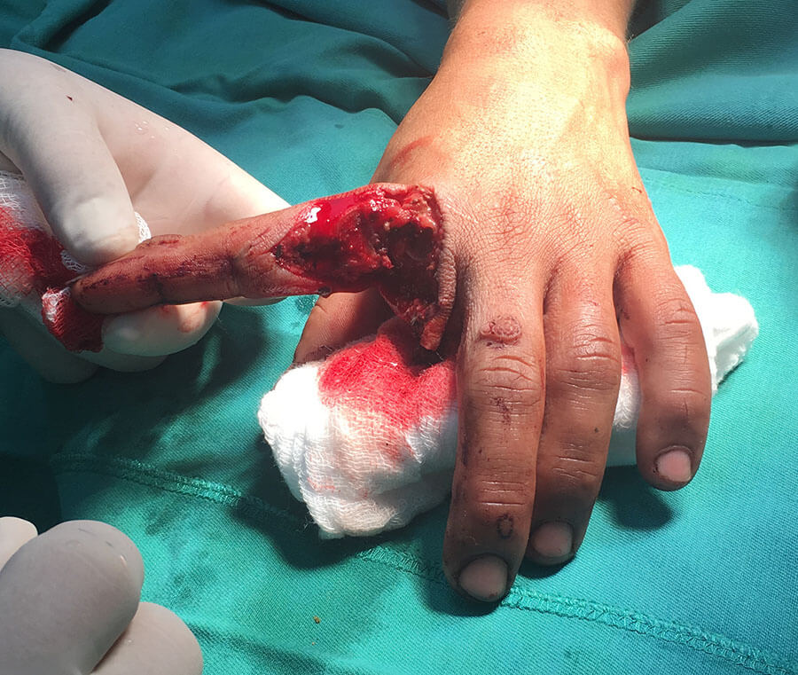 Una vez en quirófano realizamos una limpieza de las heridas y evaluamos la parte vascular, nerviosa y ligamentaria, gracias a que en el fragmento no lesionado por la sierra se mantenía intacto el paquete vascular teníamos un buen pronóstico de sobrevida de ese dedo.