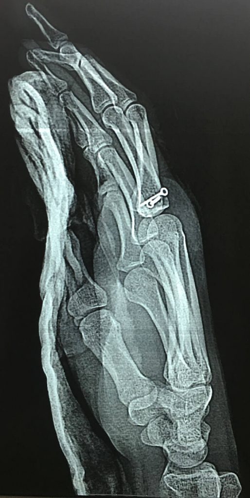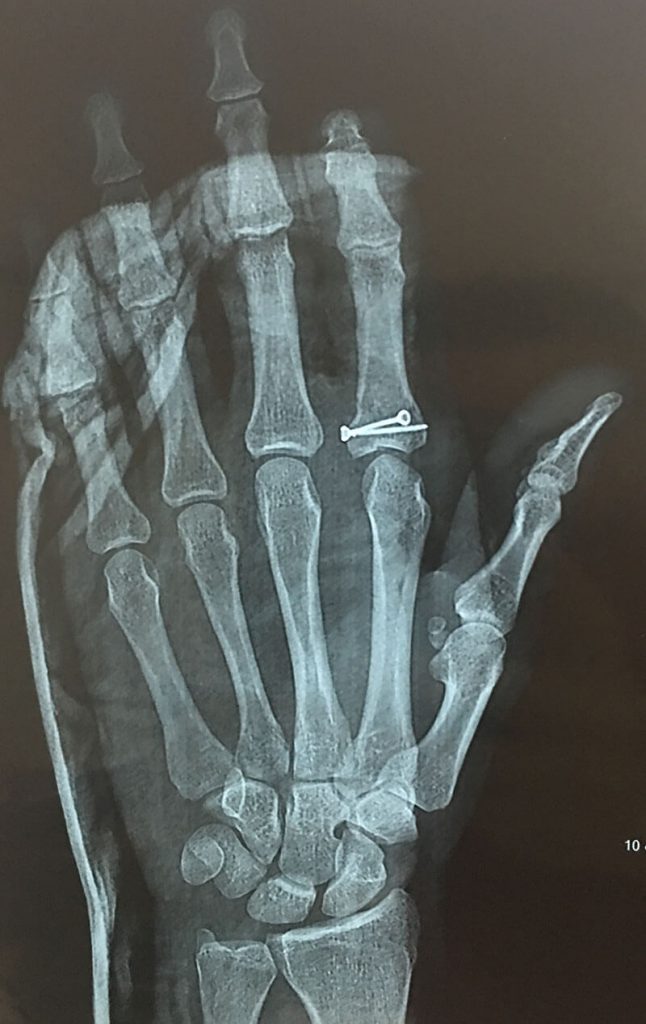 Tras la reparación de los tejidos y la fijación de la fractura fue inmovilizado y al momento el paciente ha reiniciado la movilidad empezando exitosamente la rehabilitación de su dedo de la cual esperamos una recuperación funcional al 100%.