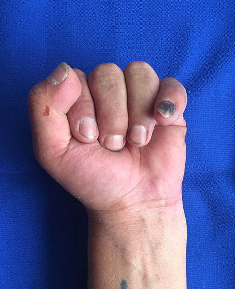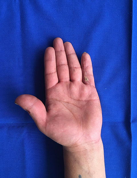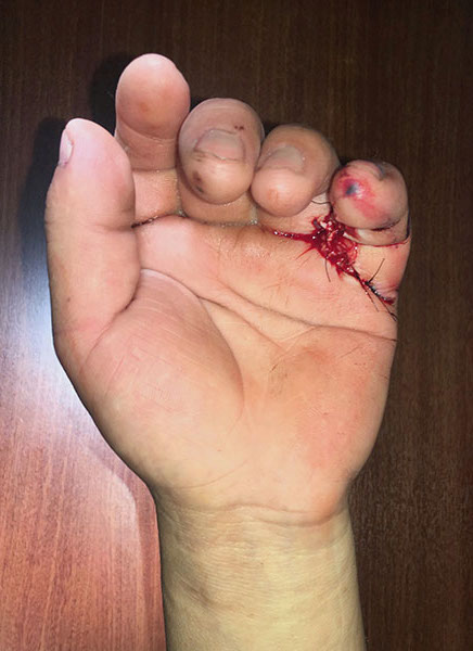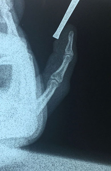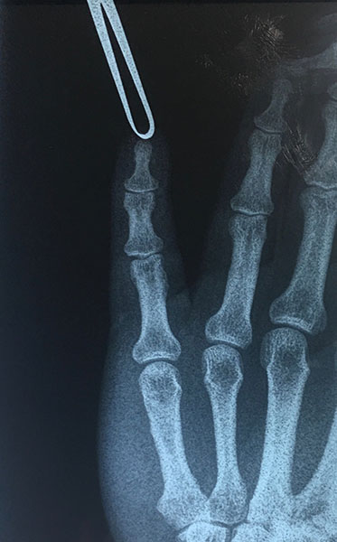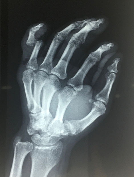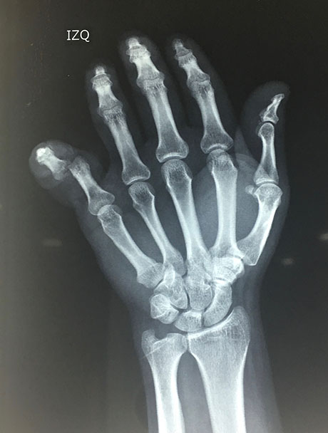 Nuestro paciente mientras ayudaba con el levantamiento de una maquinaria pesada sufre un accidente en que dicha maquina cae sobre su dedo meñique, tras esto se da cuenta que el dedo se ha estallado dejando ver su hueso y una importante herida, nota además deformidad del dedo, es llevado de inmediato a un hospital de la ciudad donde tras ser evaluado y hacerle radiografías le sugieren realizar amputación del dedo pero el paciente no la acepta y decide comunicarse conmigo como cirujano especialista en mano.